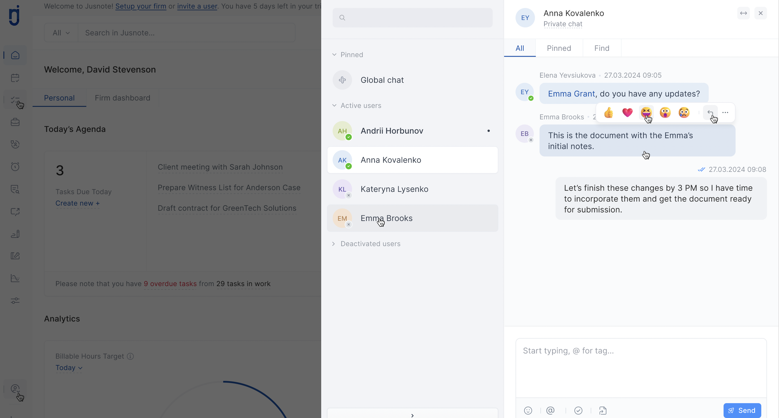 Private Chat (user-to-user) is an additional Jusnote feature that allows users to communicate directly with each other inside the system.