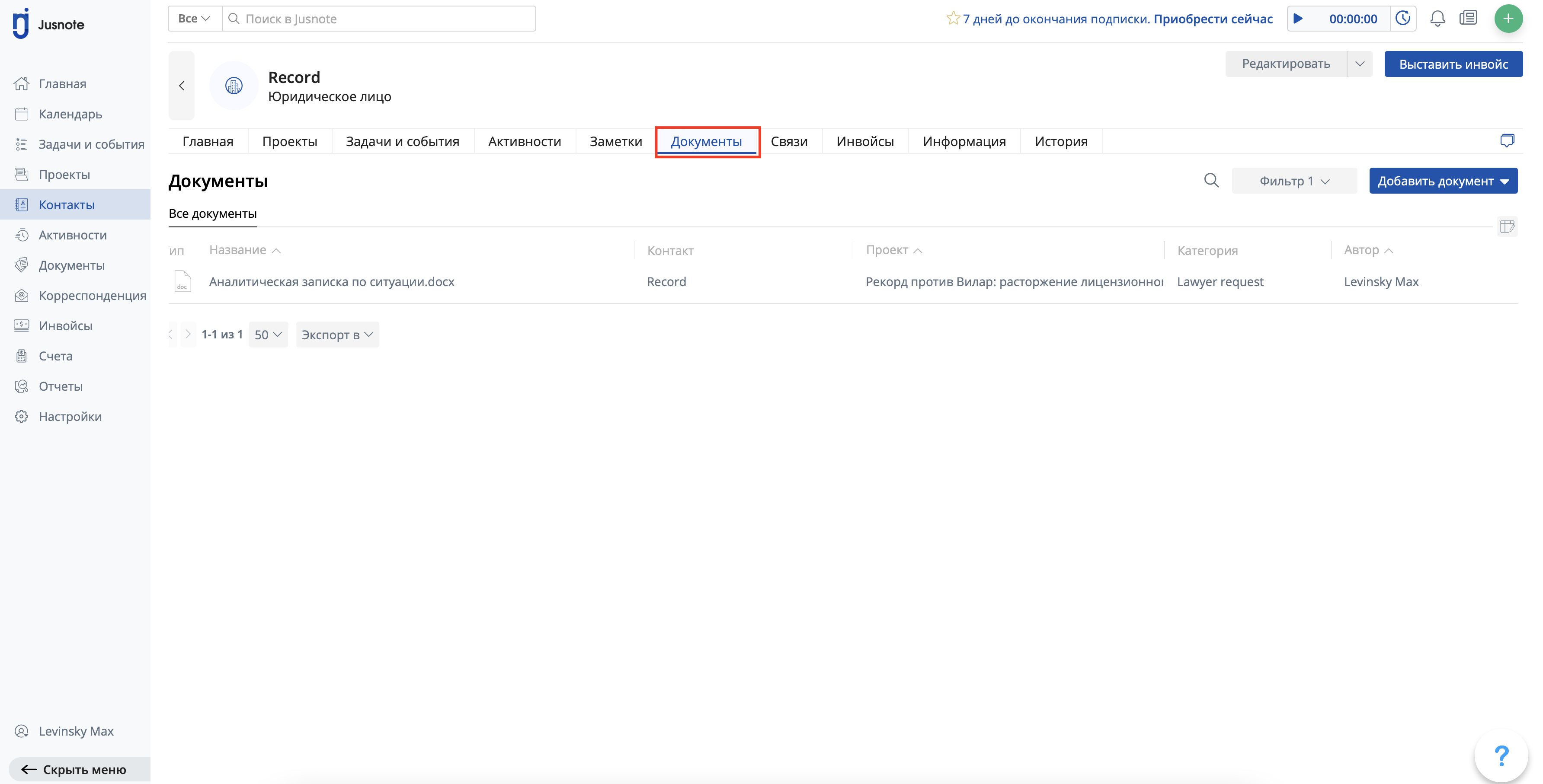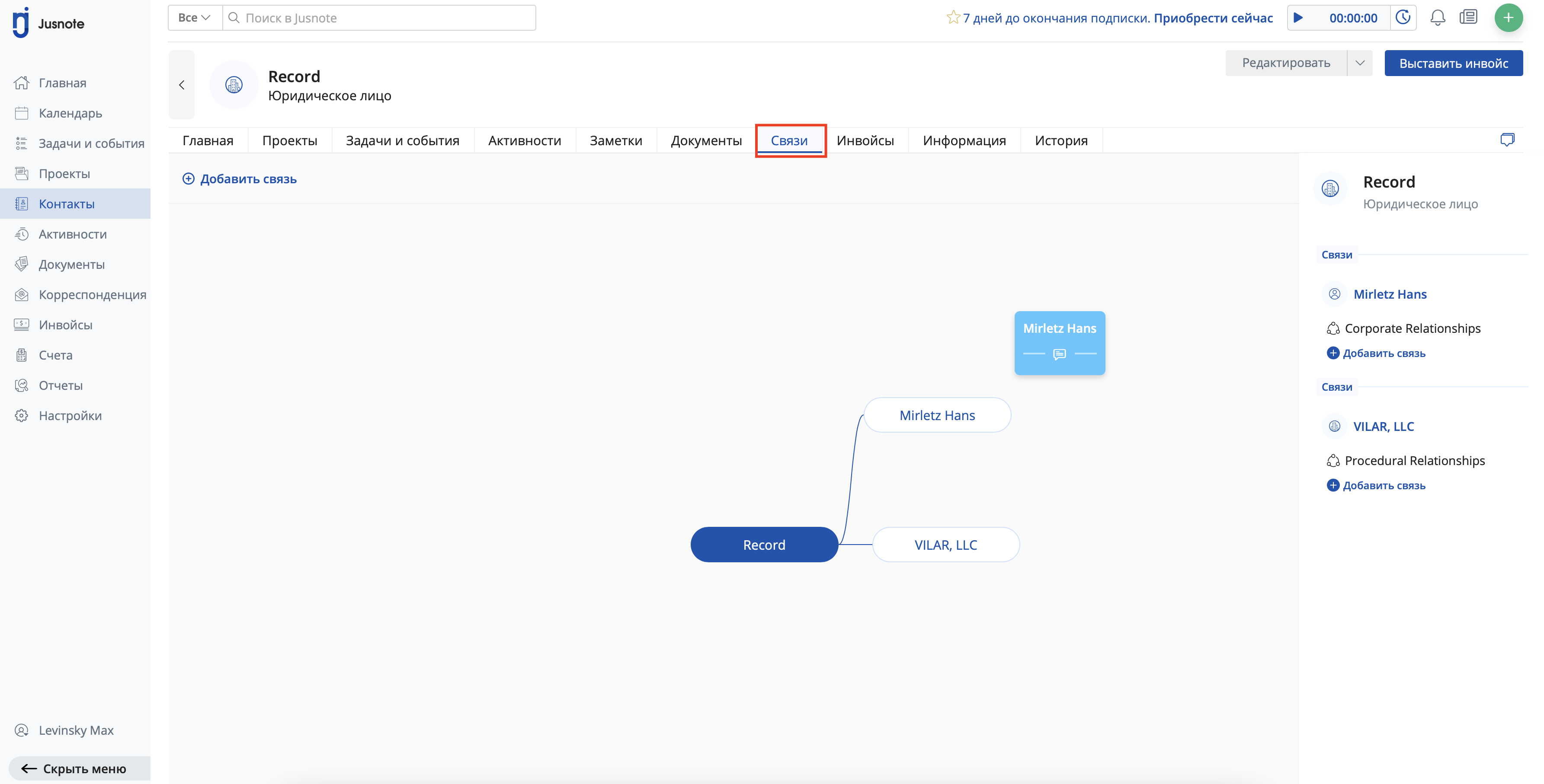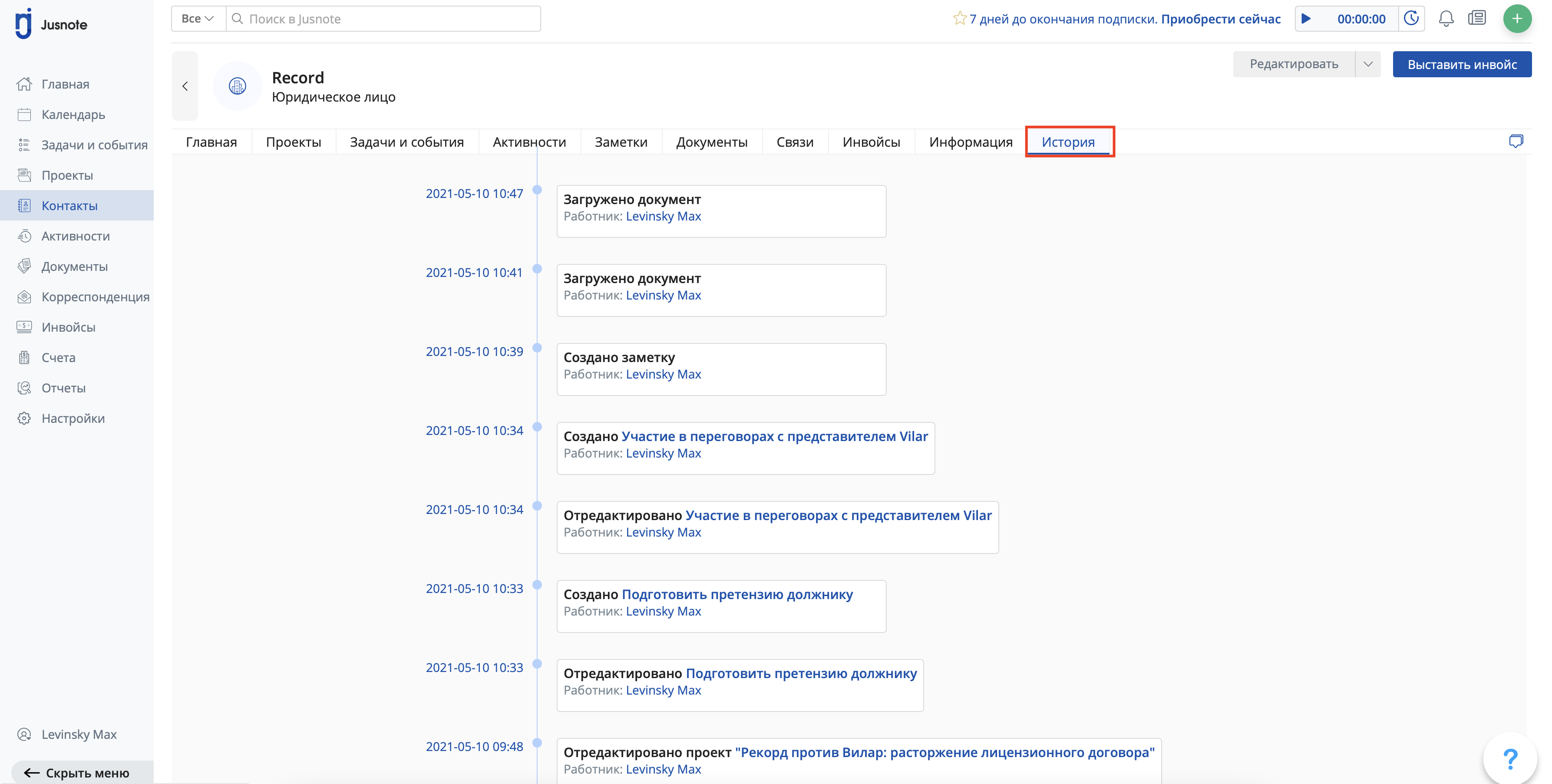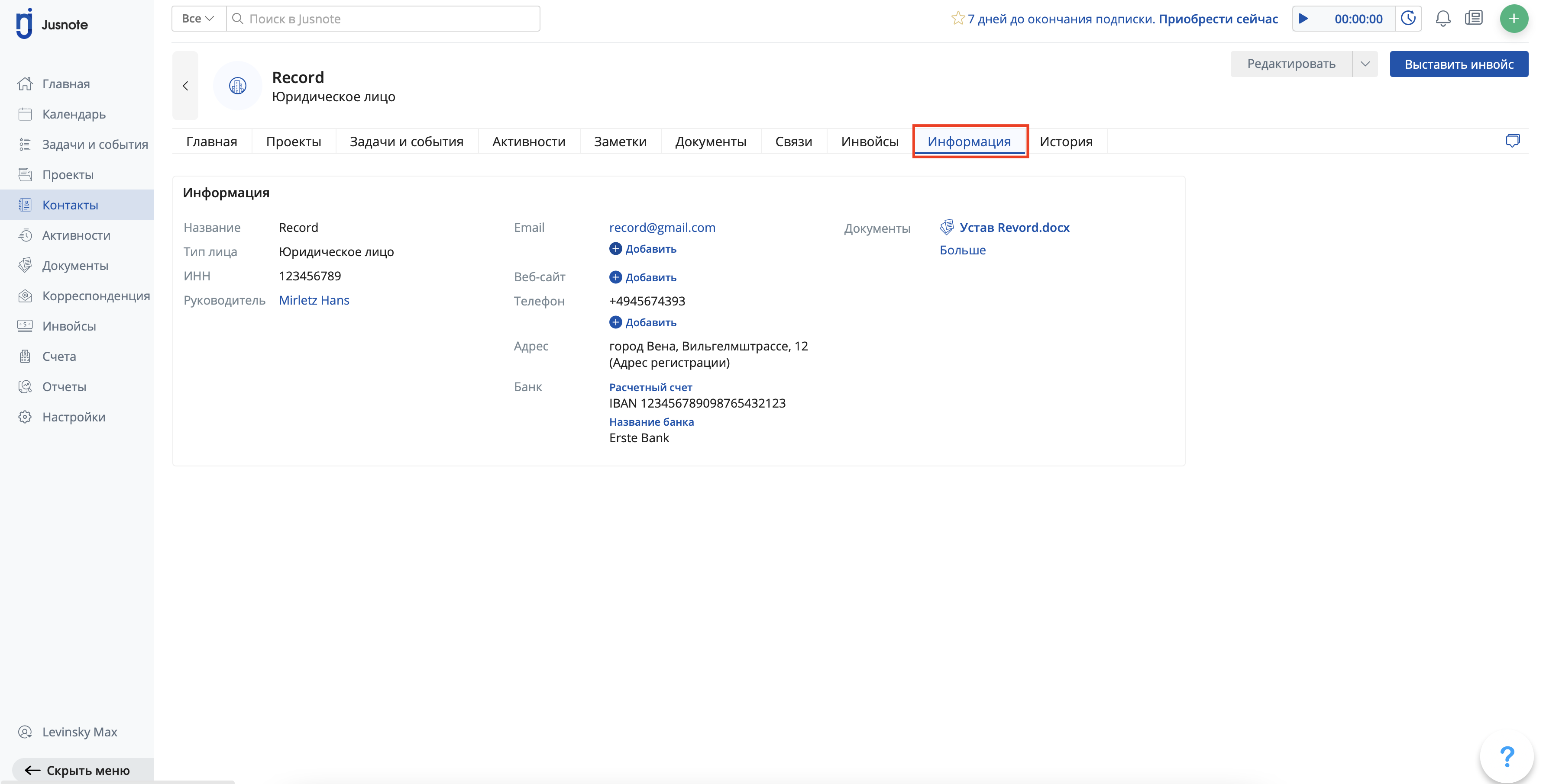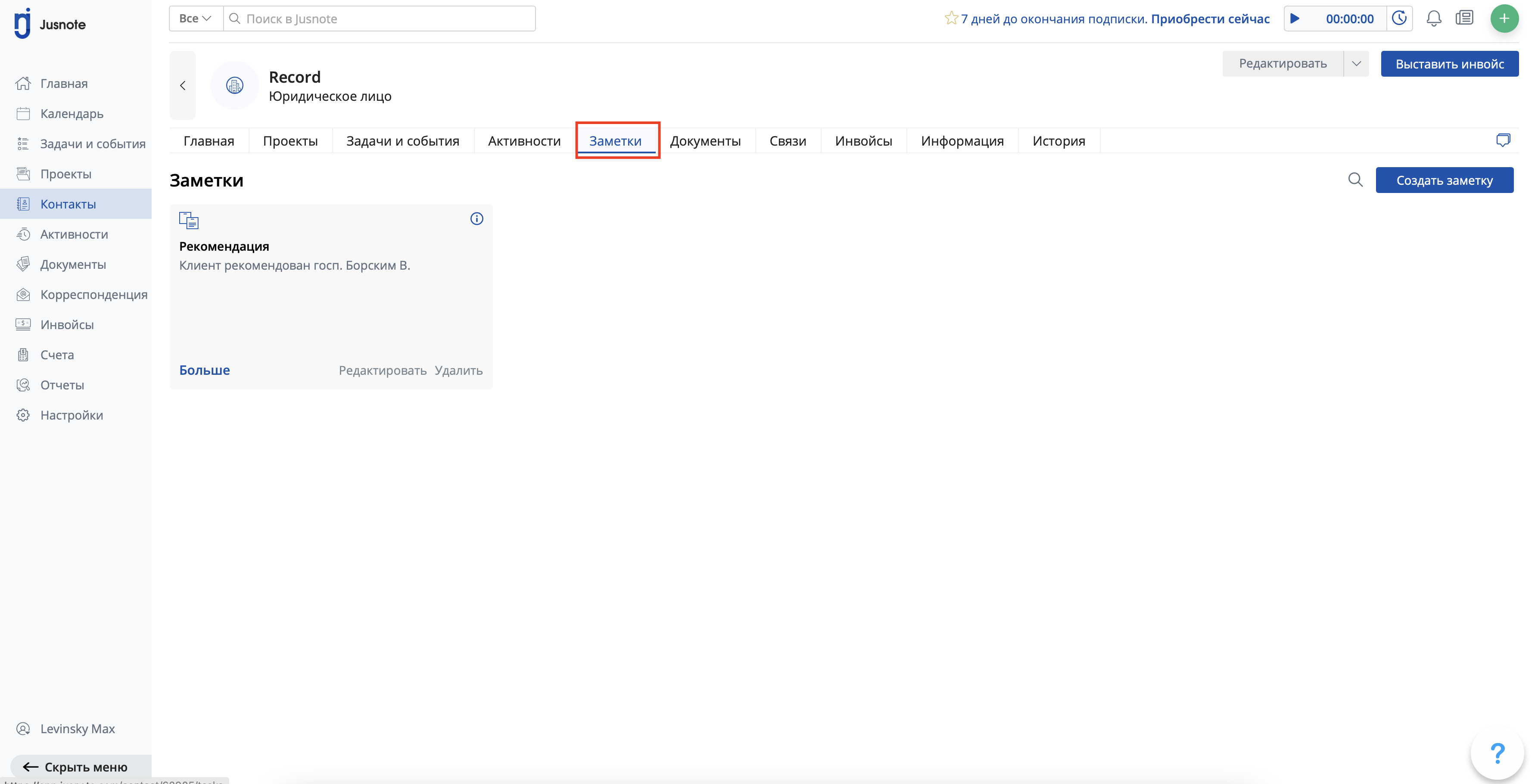На странице Контакта содержится много полезной информации, которая собирается по контакту из разных разделов Jusnote.