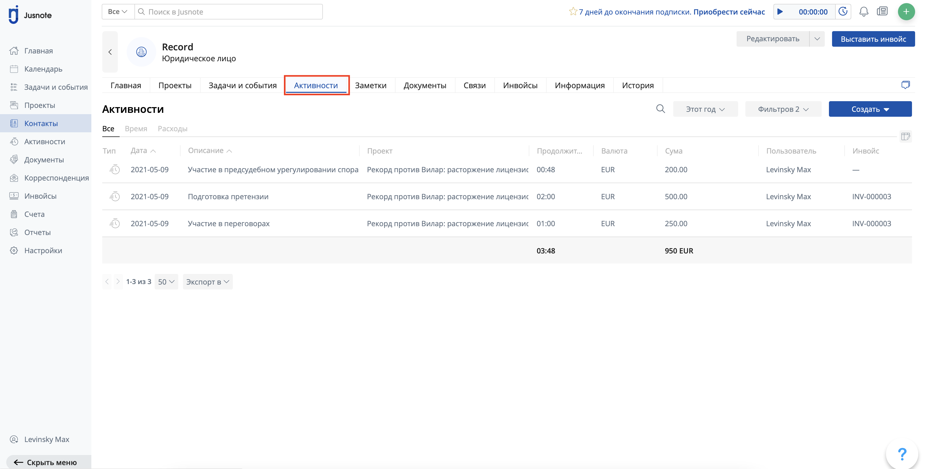 Вкладка «Активности» содержит все забиллингованное юристами время по всем проектам клиента.