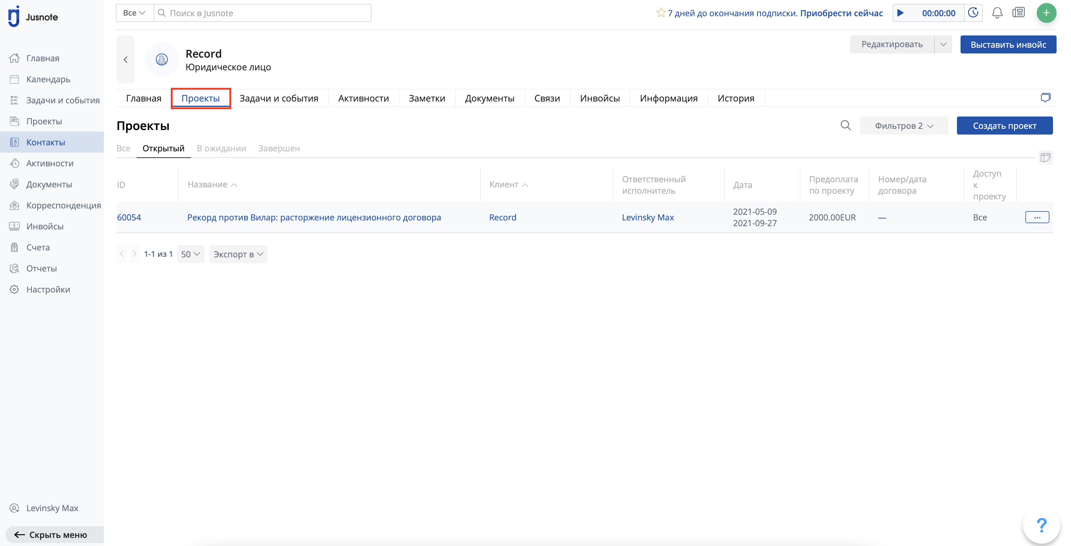 Обратите внимание, в указанной вкладке будут отображаться только те проекты, к которым у пользователя есть доступ. Для дополнительной информации о правах доступа к контакту, пожалуйста, перейдите по ссылке.