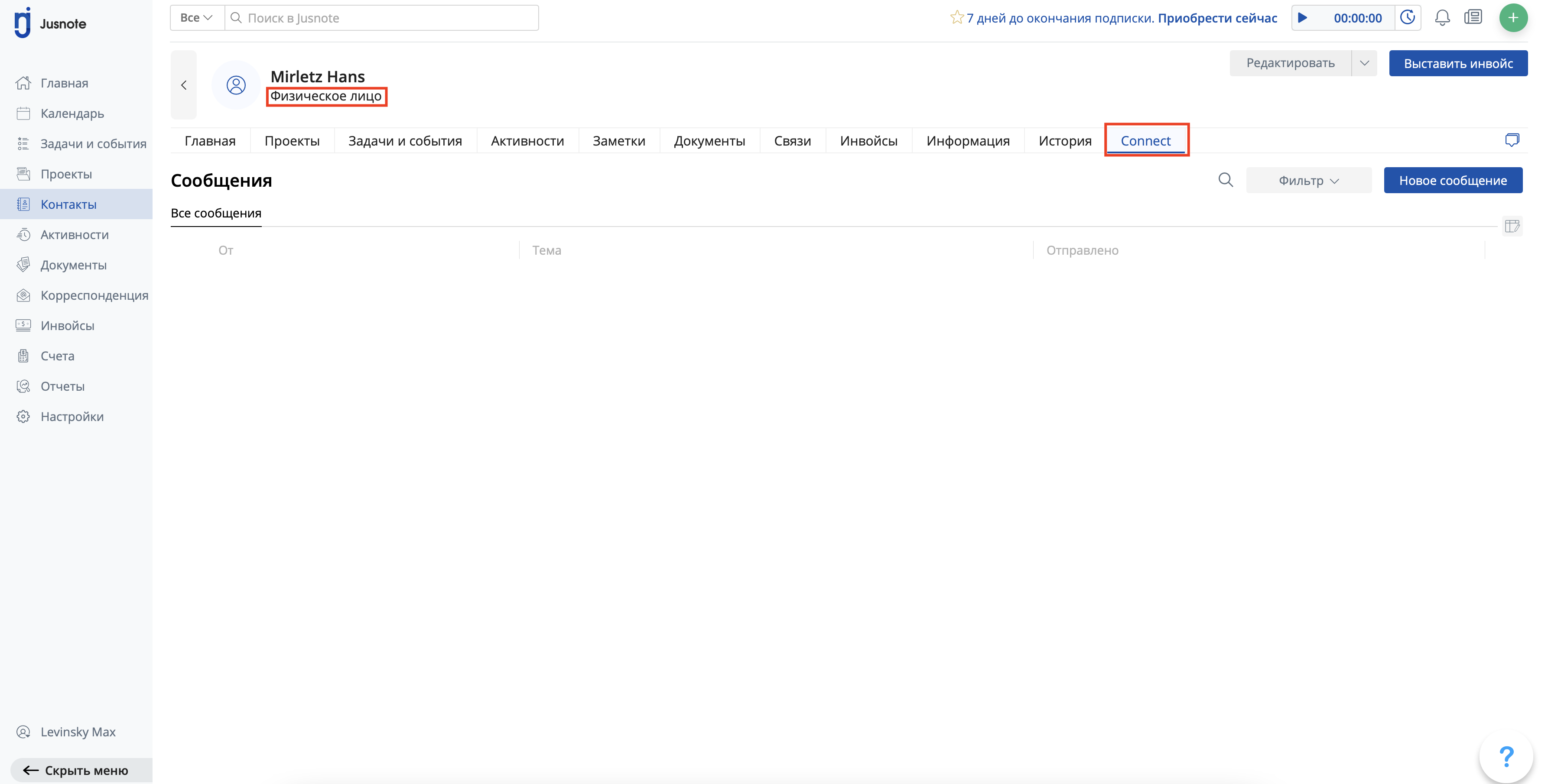 Вкладка "Connect" содержит все документы, инвойсы и сообщения, которыми вы поделились с контактом из Jusnote. Для получения дополнительной информации о Jusnote Connect нажмите