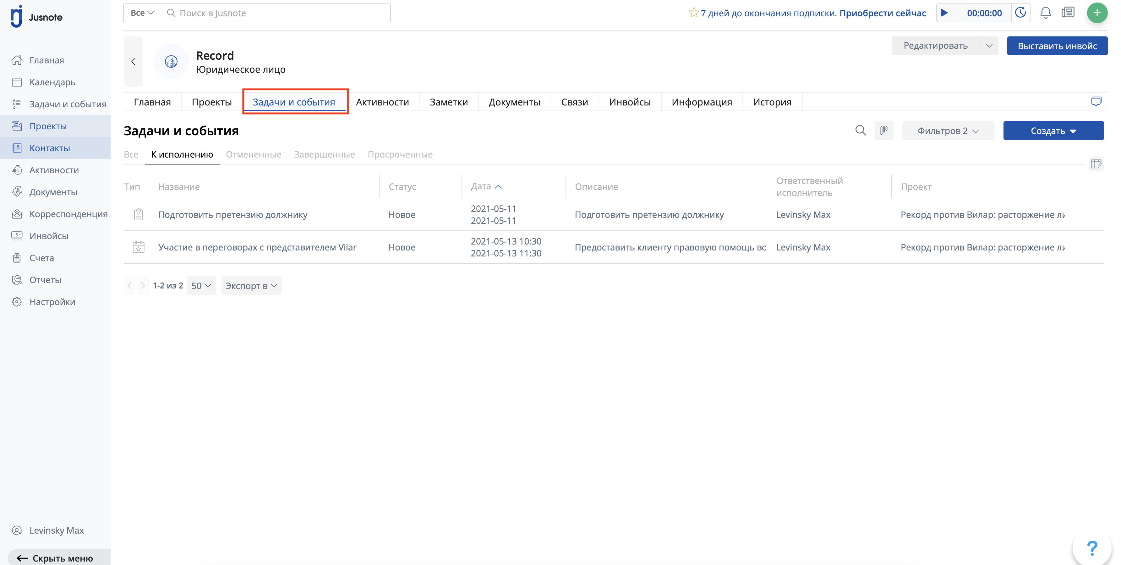 Вкладка «Задачи и события» содержит все задачи и события по клиенту. Здесь вы можете просматривать задачи и события клиента и управлять ими.