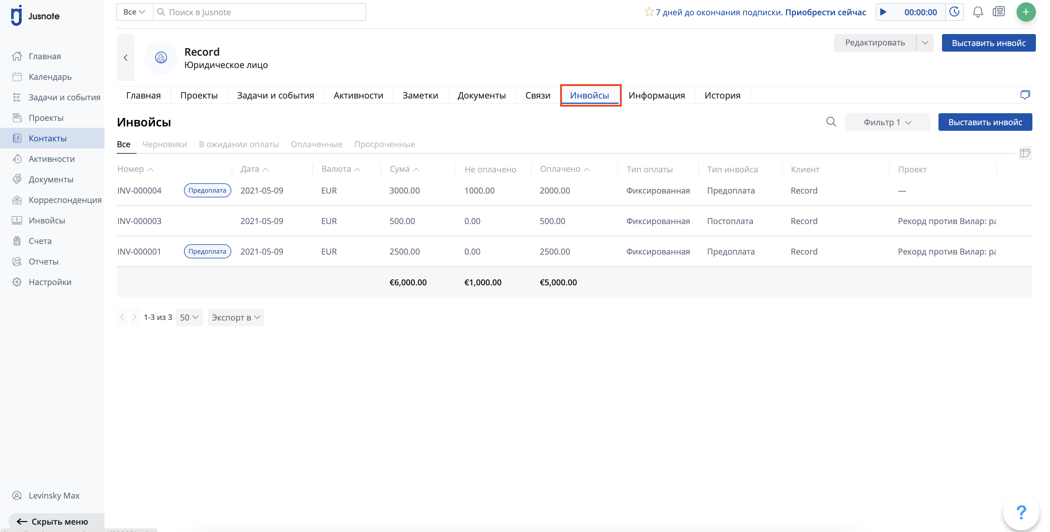 Выставить инвойс" вы быстро можете изменить данные контакта или же выставить инвойс на предоплату или постоплату.
