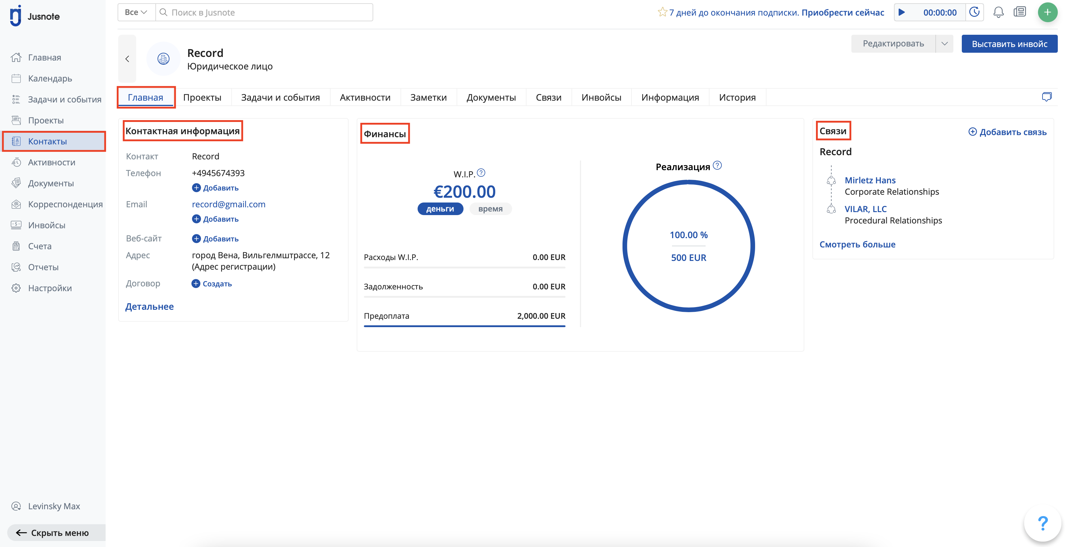 Вкладка "Главная" была разработана, чтобы показать менеджерам, администраторам и пользователям Jusnote ключевую персональную или контактную информацию о контакте, финансовых показателях работы с клиентом и связях данного контакта с другими лицами.