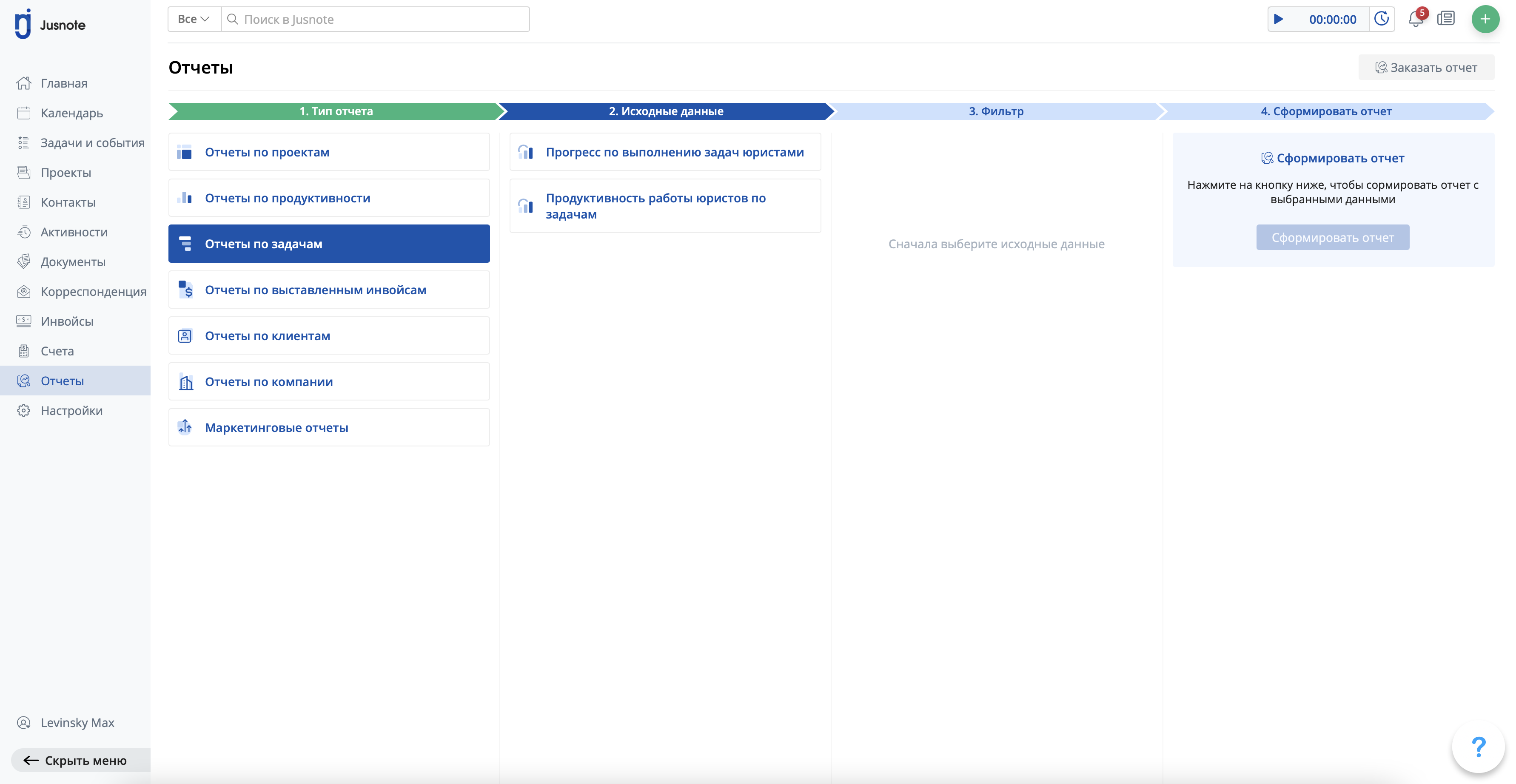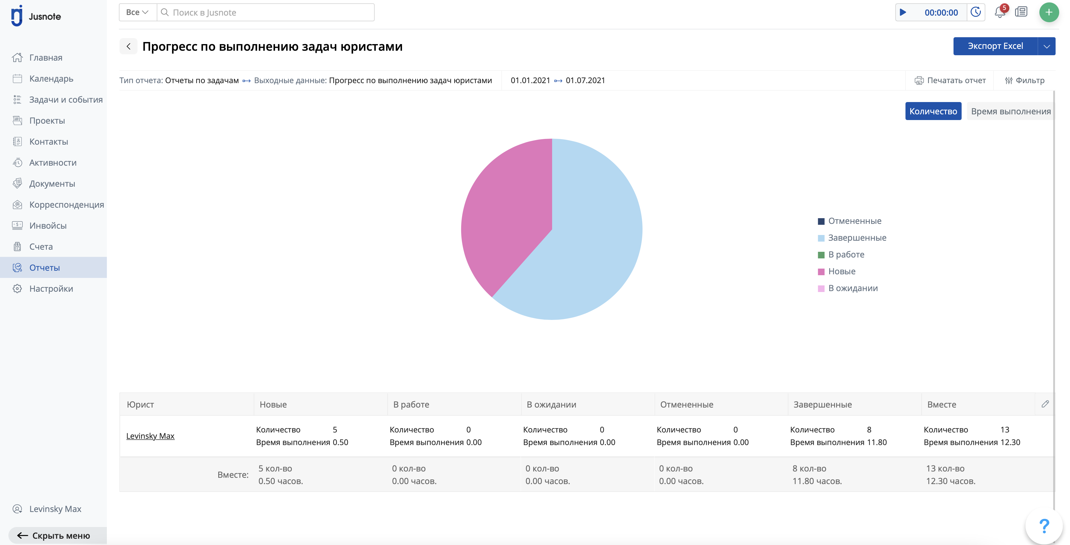 Отчеты о задачах содержат информацию о прогрессе выполнения задач юристами и продуктивность их работы при выполнении задач.