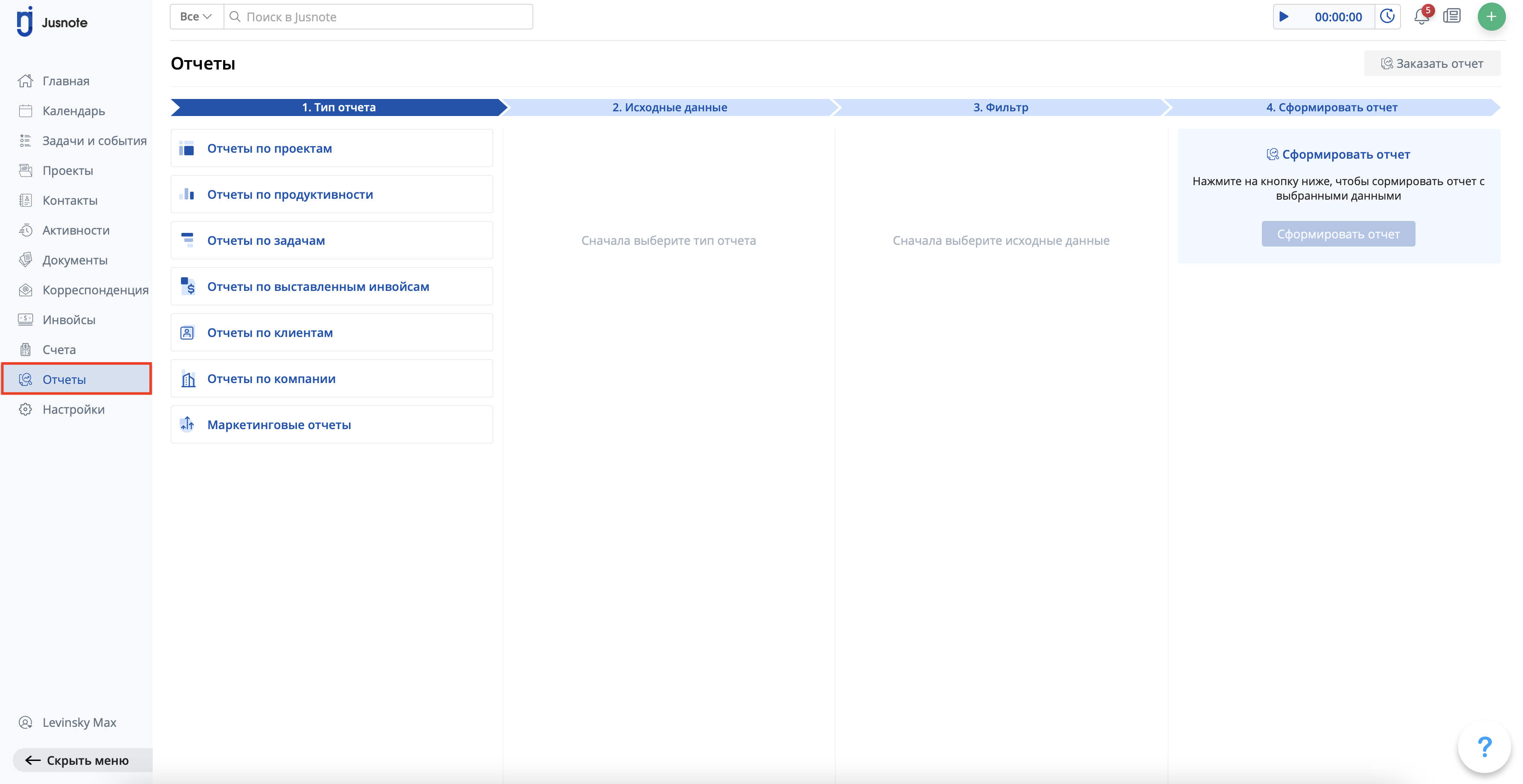 При работе с отчетами в Jusnote вы можете захотеть получить конкретную информацию по клиентам, сотрудникам или компании в целом. Ниже каждая категория отчетов содержит возможность перейти на более развернутую статью по каждому отчету.