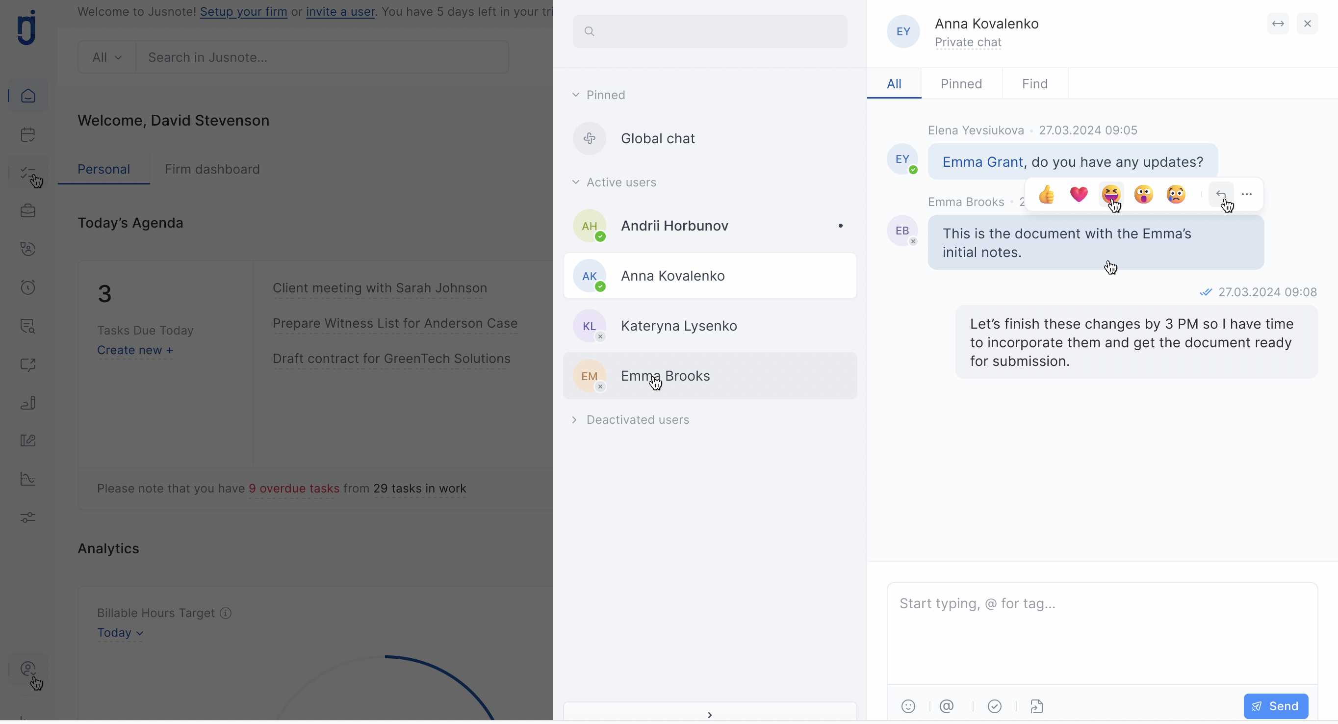 Сучасний інтерфейс Чату в Jusnote дозволяє покращити спілкування та комунікацію вашої команди не виходячи з програмного забезпечення. Завдяки Чату ви можете залишати коментарі, думки або ділитися документами чи посиланнями на задачі та події зі ...