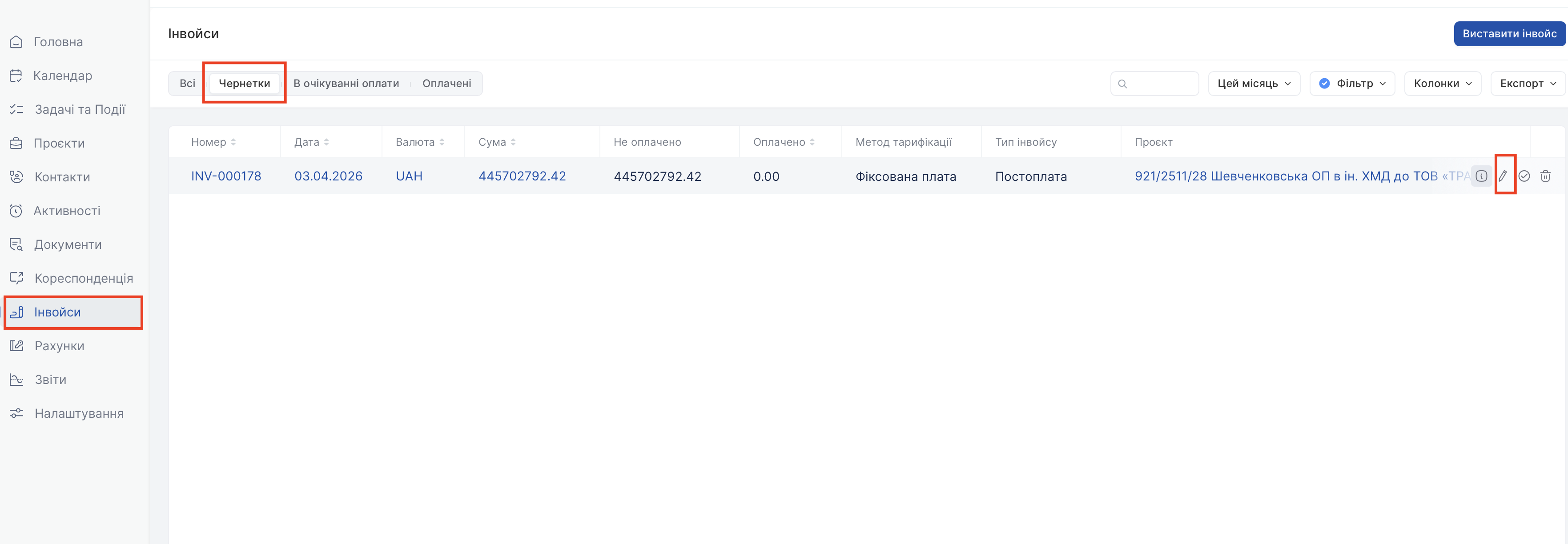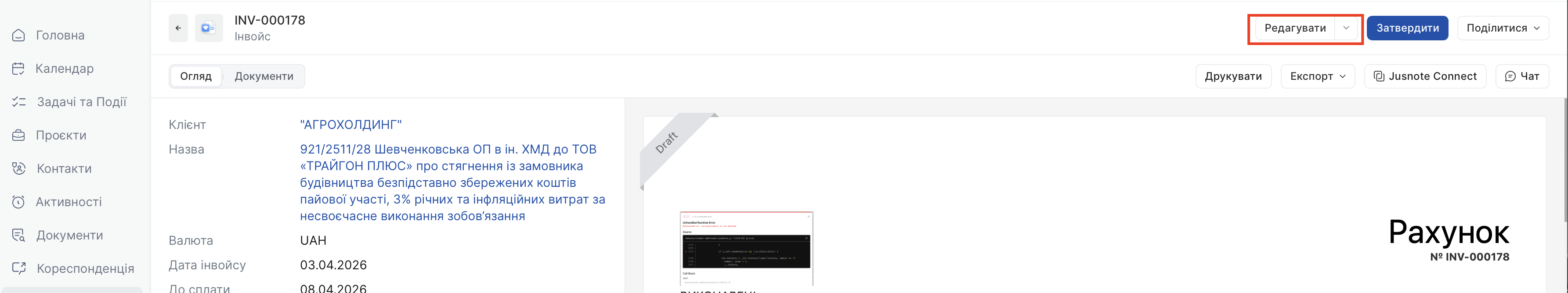 Сторінка редагування інвойсу містить кілька основних блоків.