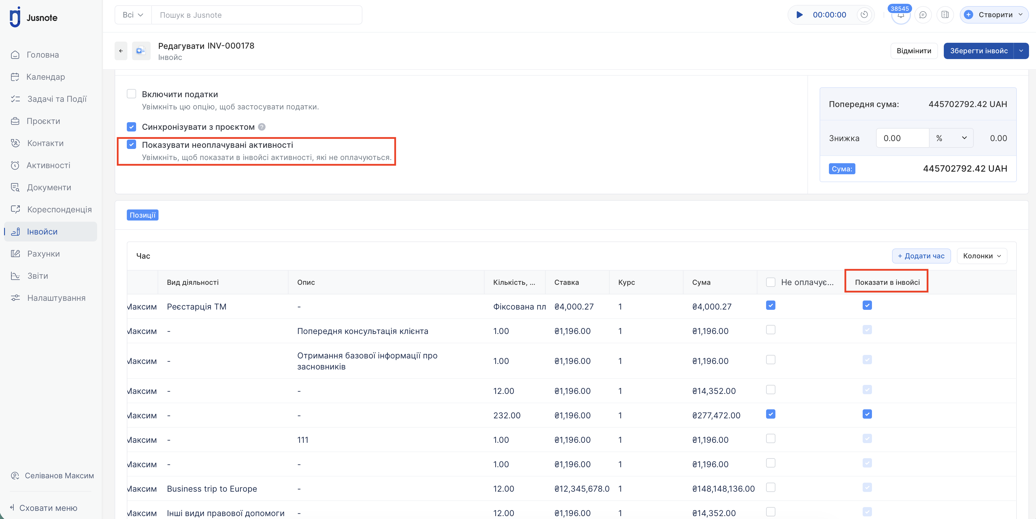 Jusnote підтримує два рівні логіки для відображення неоплачуваних активностей у інвойсі.