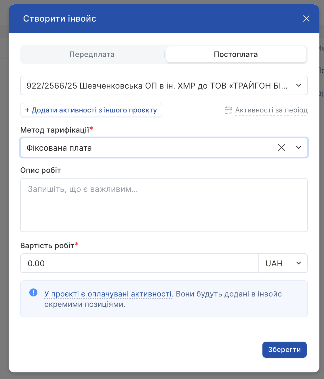 Примітка: при створенні інвойсу на постоплату з методом тарифікації “фіксована плата” система автоматично створює в розділі активностей запис із фіксованою платою. Дата цього запису збігається з датою створення інвойсу. Така логіка дозволяє зберегти повну історію нарахувань у проєкті, включити фіксовану плату в загальну аналітику та забезпечити коректність фінансових показників нарівні з іншими активностями.
